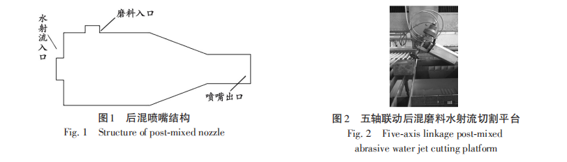 采用HSQ4020S五軸龍門水切割機(jī)。高壓水發(fā)生器產(chǎn)生高壓水, 通過極細(xì)口徑的寶石水噴嘴進(jìn)入混合腔,產(chǎn)生負(fù)壓吸入磨料[7],混合之后由砂管噴出,對材料進(jìn)行切割。后混噴嘴結(jié)構(gòu)如圖1所示,試驗(yàn)切割平臺(tái)如圖2所示,利用數(shù)控工作臺(tái)可以精確改變橫移速度、靶距和泵 壓等參數(shù)。