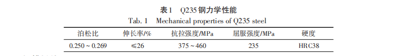 選用工業(yè)上常用的石榴石作磨料,主要粒徑有60,80,120目3種。莫氏硬度為 7.5,努氏硬度為 1 350, 磨料密度為3.5 g/cm3。后混噴嘴砂管為標(biāo)準(zhǔn)配件,選用3種不同直徑的砂管,分別為 0.8,1.0,1.5 mm。選用 油氣儲(chǔ)存運(yùn)輸常用的Q235鋼作為切割材料,其力學(xué)性能如表1所示。試驗(yàn)過程中,保持磨料閥開度不變,調(diào) 節(jié)泵壓、橫移速度、靶距和入射角等參數(shù),另外可以實(shí)現(xiàn)手動(dòng)更換砂管以及磨料。