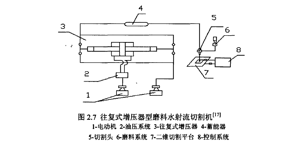 第二種是目前國外采用較多,國內(nèi)普遍采用的往復(fù)式增壓器方式,其系統(tǒng)構(gòu)成如圖2.7所示。主要由油壓系統(tǒng)、供水系統(tǒng)、往復(fù)式增壓器系統(tǒng)、以蓄能器為核心的恒壓系統(tǒng)、噴嘴和管路等組成。其特點是油壓系統(tǒng)采用現(xiàn)有的液壓技術(shù)和元件就能解決,往復(fù)式增壓器及蓄能器用戶可以自己開發(fā)研制、加工制造并非十分復(fù)雜。但往復(fù)式增壓器兩個高壓腔中的壓力相位始終相差180度,排水和吸水動作是不連續(xù)的,產(chǎn)生的壓力存在波動。