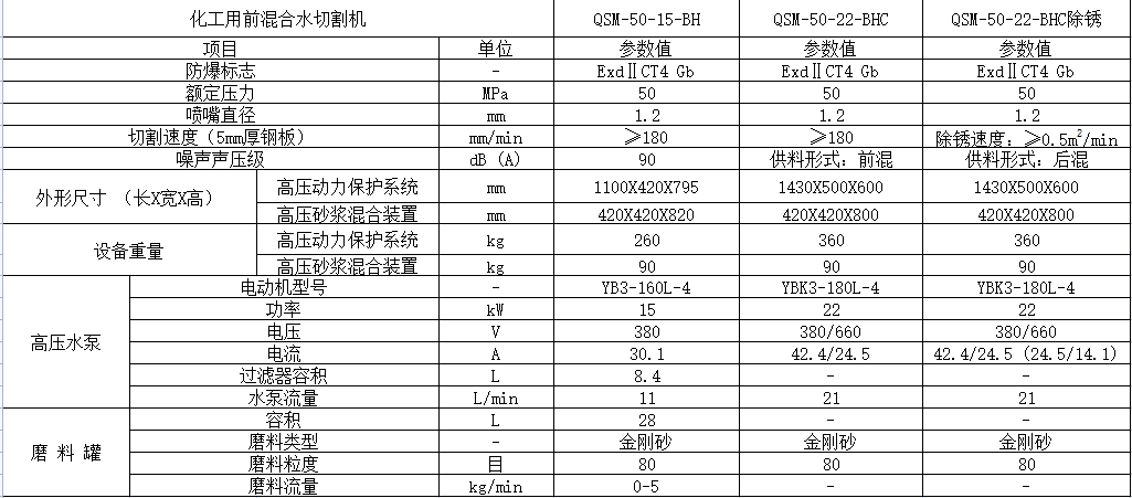 QSM-50-15-BH型化工用前混合水切割機,適用于化工儲罐、石化管道、圓柱類金屬的切割和化工廠拆除維修、打孔切口、清洗除銹等。是在化工企業易燃易爆環境實施切割作業的安全設備。本機型可切割厚度0.1- 100mm的任何材質(金剛石及特種硬質合金除外)。
